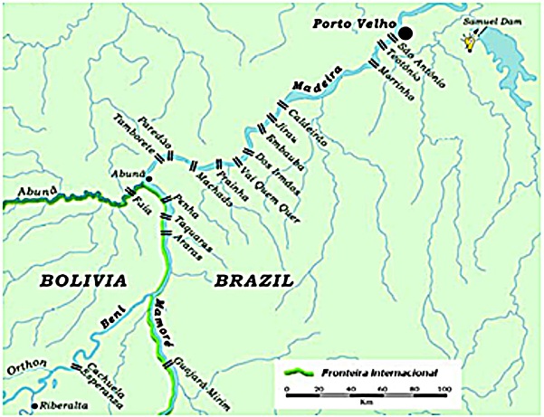 Figura 1 – Localização das cachoeiras no alto rio Madeira. Fonte: Dados Topodata, INPE. Elaboração: Michelle M. Tizuka.